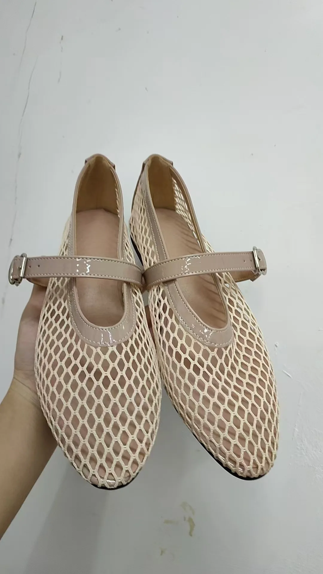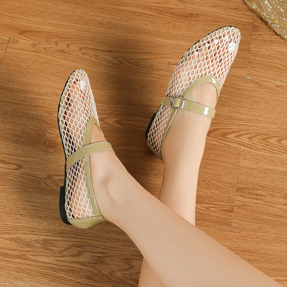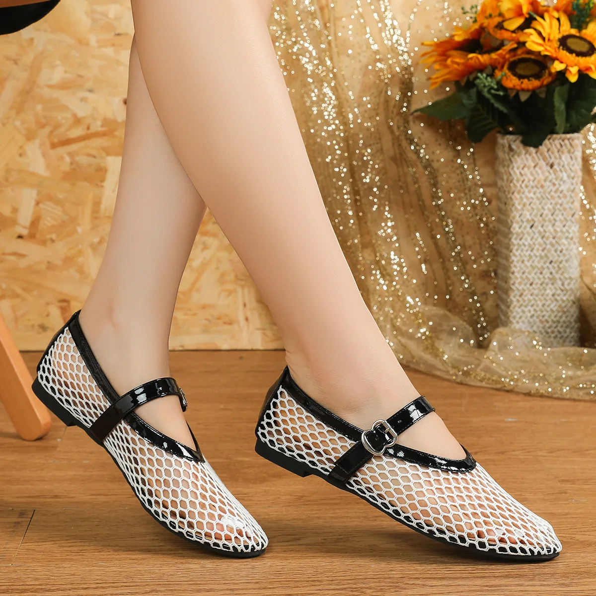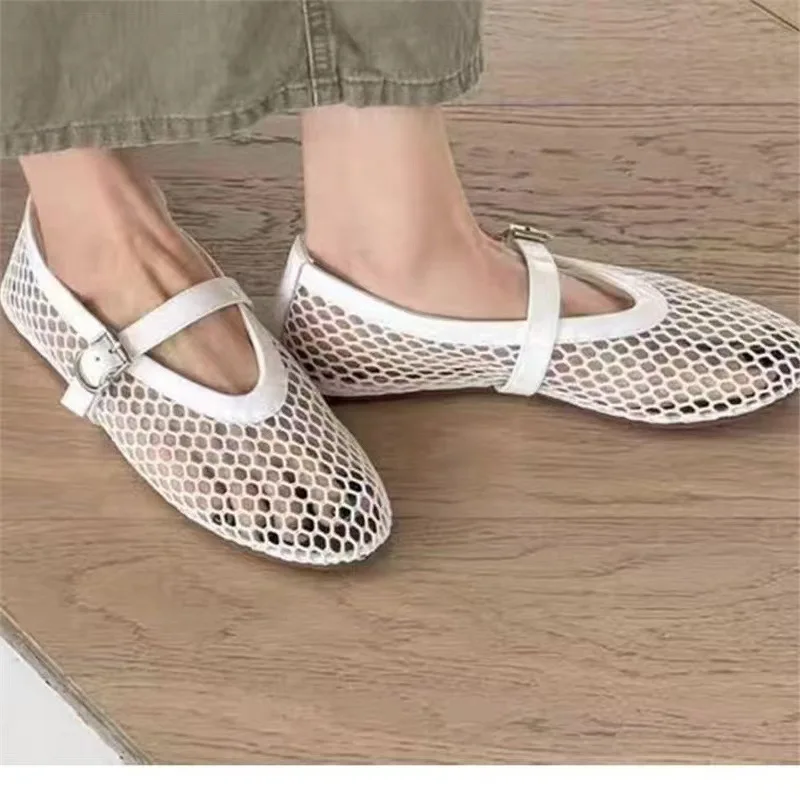 New Summer Mesh Falts Shoes Women Sandals Breathable Ballet Comfortable Mary Jane Leisure Buckle Strap Women Loafers Shoes 2024